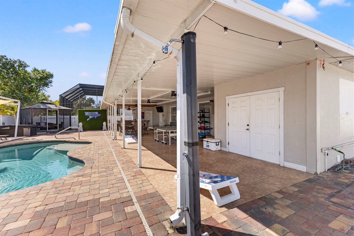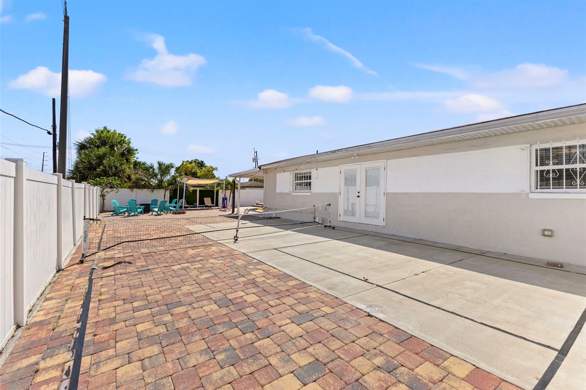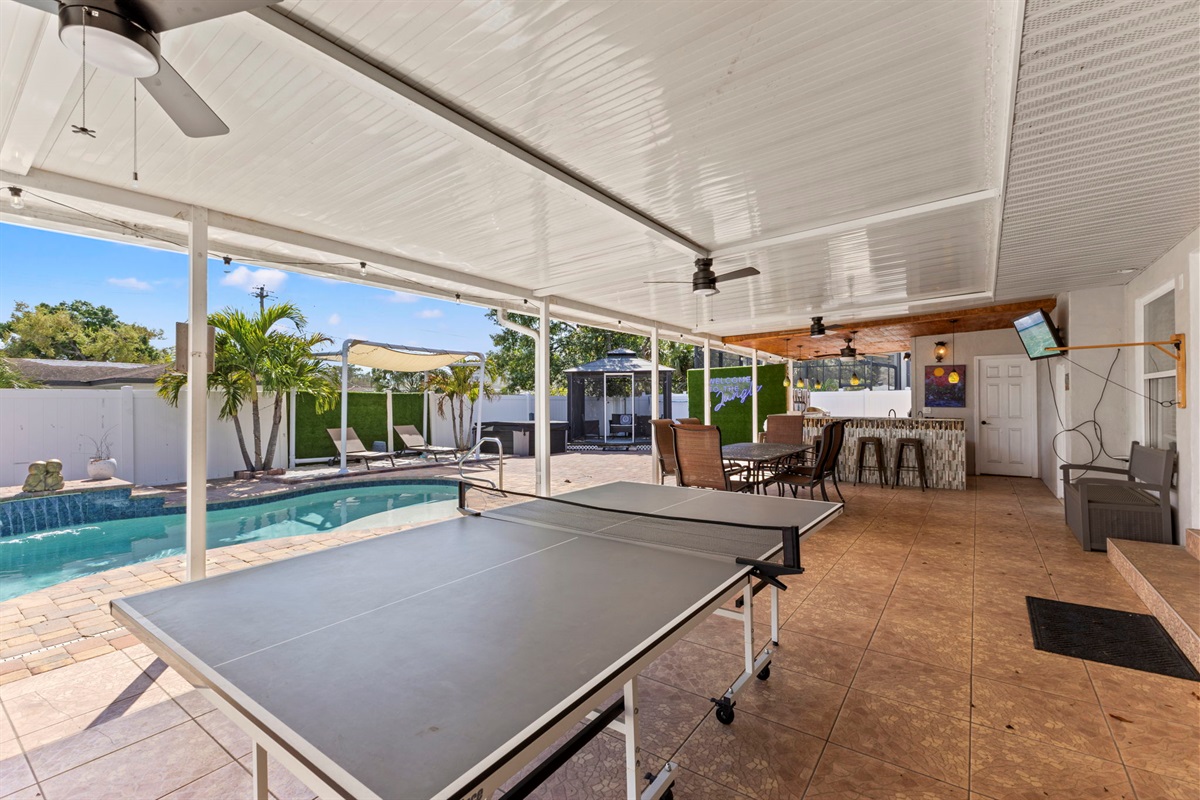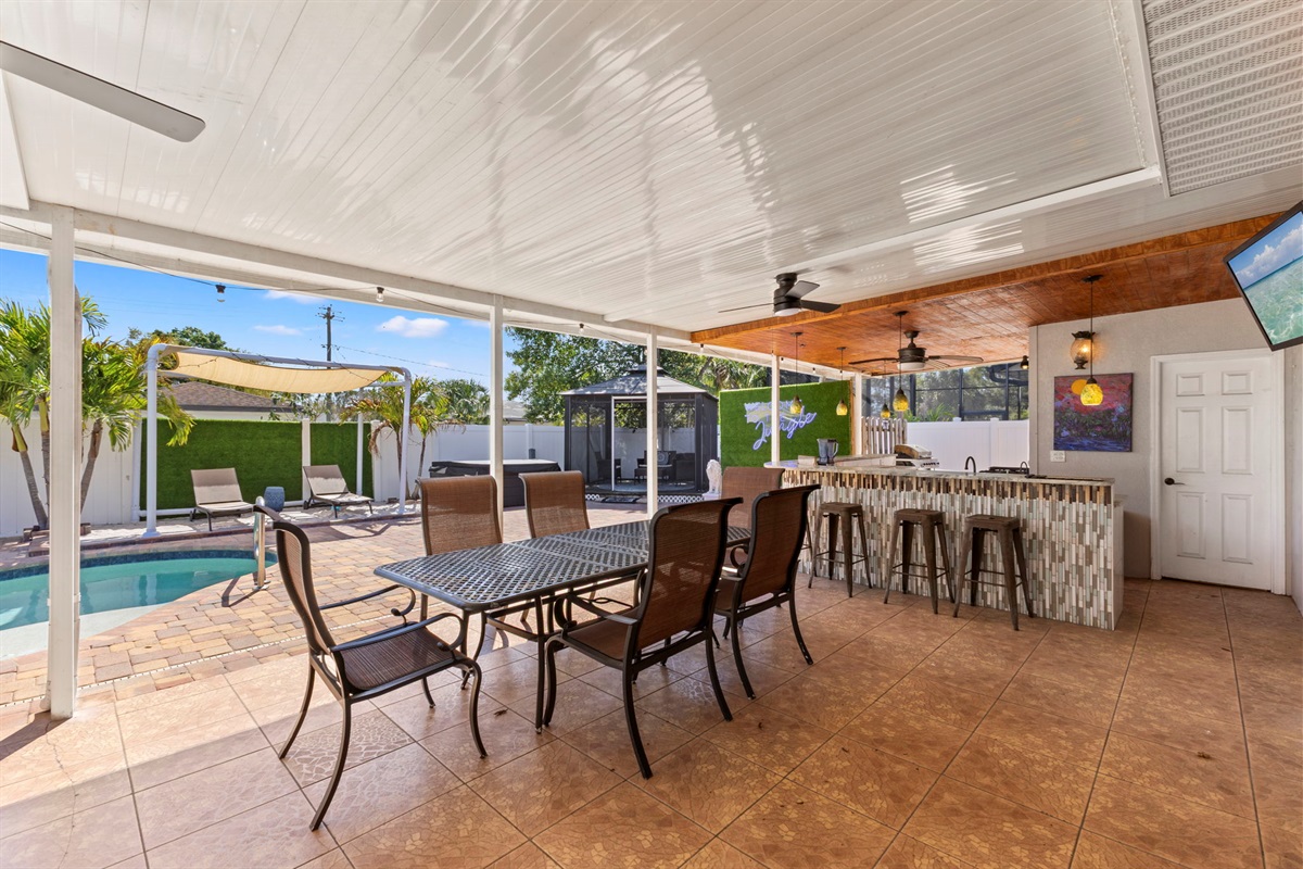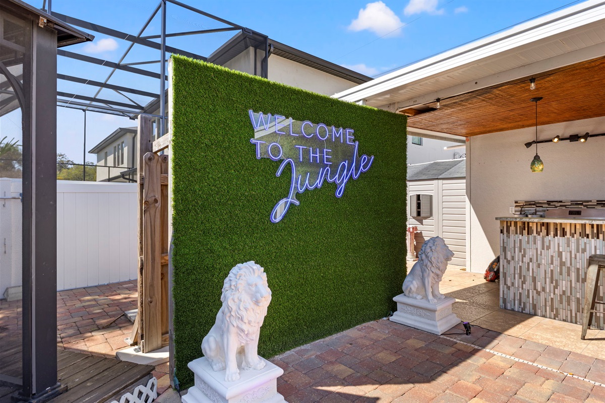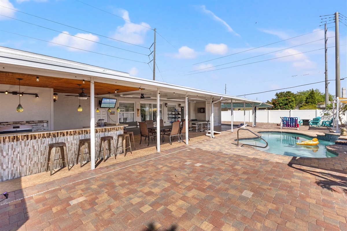 ☀ UNBELIEVABLE backyard w/ HOTTUB and HEATED Pool with waterfall feature + relaxing cabana in the sand + full outside equipped bar seats 8 with mini fridge & TV perfect for game days + pickleball court + fire pit + outdoor games including (large jenga, cornhole, ping pong, darts) + The grassy wall is a unique feature that provides a perfect backdrop for your vacation photos & so much more! You’ll never want to leave this outdoor oasis! Heat for pool is extra $50/day